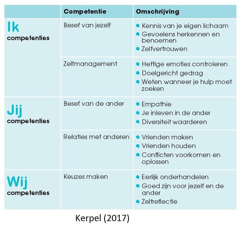 volgens Kerpel (2017) is sociaal- emotioneel leren het proces waarbij leerlingen noodzakelijke kennis, attituden en vaardigheden verwerven en toepassen, zodat ze beter kunnen omgaan met zichzelf.